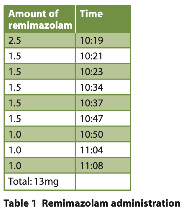 - IV access was gained using low level clinical holding. No oral premedication was required. A total of 13 mg remimazolam was given over 49 minutes. (See Table 1 for details of the top-ups given)