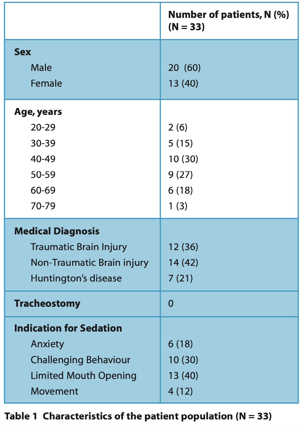 Thirty-three patients were sedated between 1 August 2023 to 26 April 2024 with some individuals (n = 10, 30%) having more than one instance of sedation, giving a total of 46 episodes. The patients' ages ranged between 21 and 75 years, with a mean of 49 years and included 13 females and 20 males. All patients were classified as ASA 3. The most-cited indication for sedation was limited mouth opening (n = 13, 39 %) and challenging behaviour (n = 10, 30%). Table 1 summarises the characteristics of the patients included in this service evaluation.