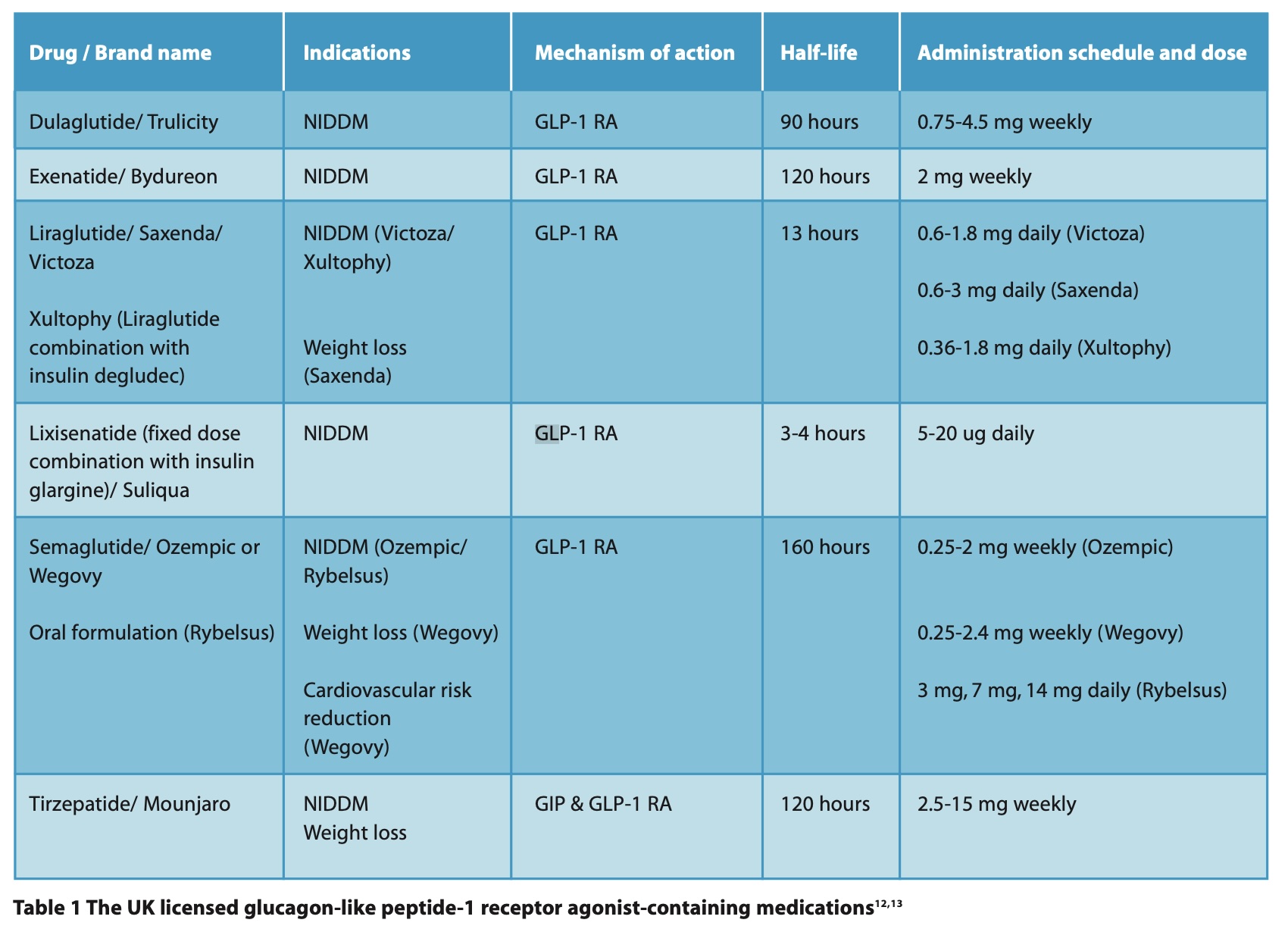 Five GLP-1 RAs and one dual GIP and GLP-1 RA are licensed in the UK (Table 1).13 GLP-1 and GIP RAs are commonly prescribed for diabetes and weight loss.12 Potential future uses for GLP-1 RAs may include respiratory disease,14 in aesthetic medicine,15 and Alzheimer’s disease.16