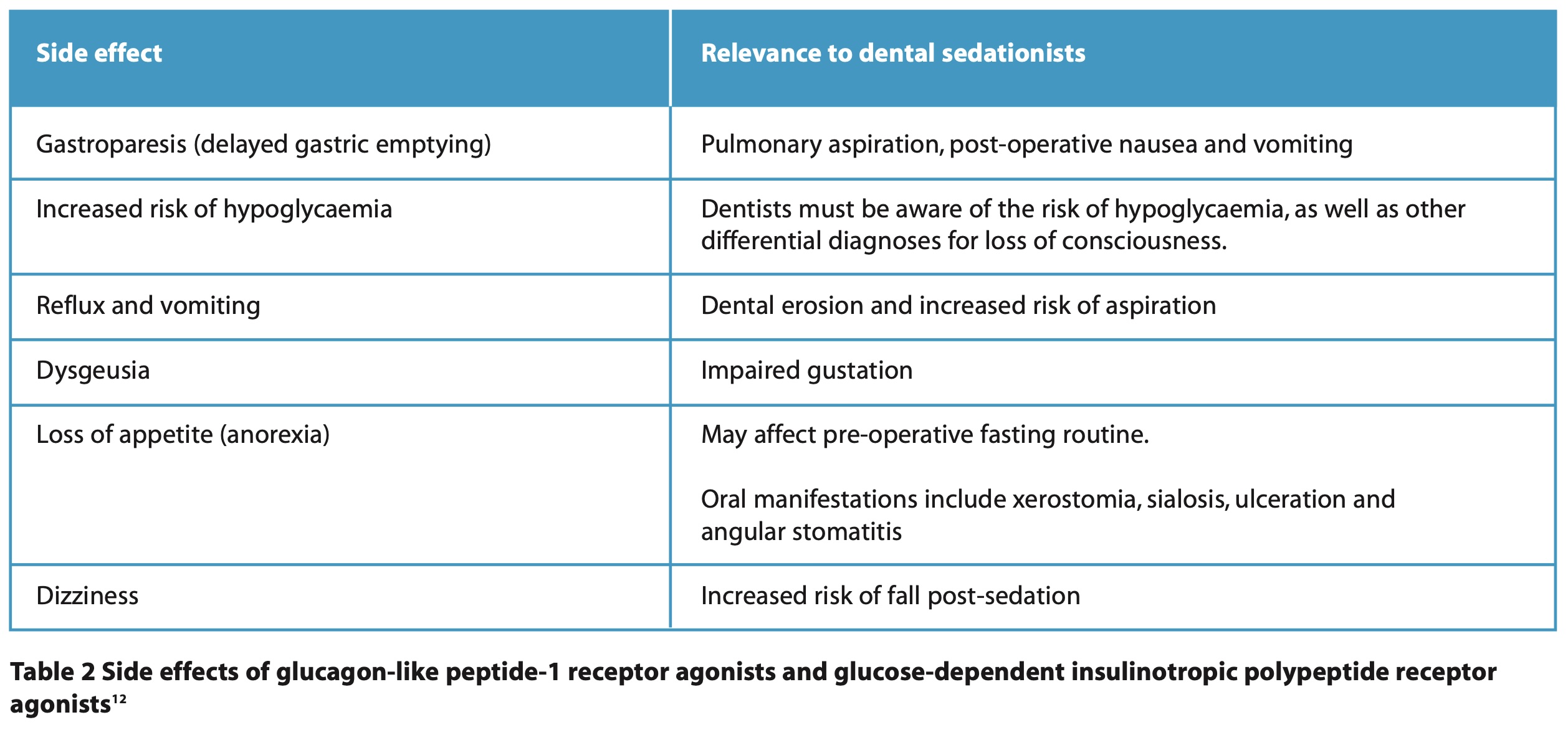 They have no interactions with benzodiazepines, nitrous oxide, N-Methyl-D-Aspartate (NMDA) receptor antagonists, or synthetic opioids used in procedural sedation in dentistry.12 They do, however, interact with erythromycin, which can reduce the effectiveness of GLP-1 RAs but also can help to accelerate gastric emptying.12