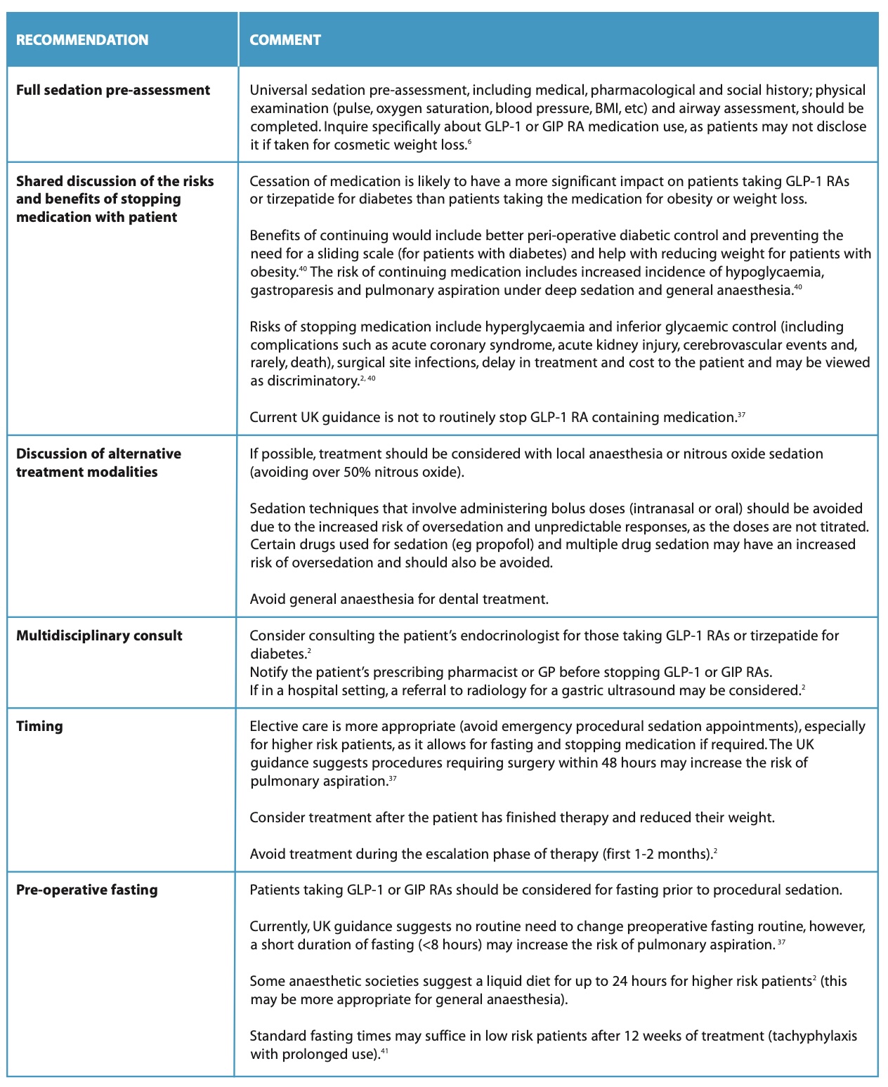 The rising demand for GLP-1 and GIP RAs means dental sedationists will likely encounter patients on these medications, who may face challenges like pulmonary aspiration during deep sedation. It is important for dental sedationists to follow the latest UK guidelines to prevent complications.