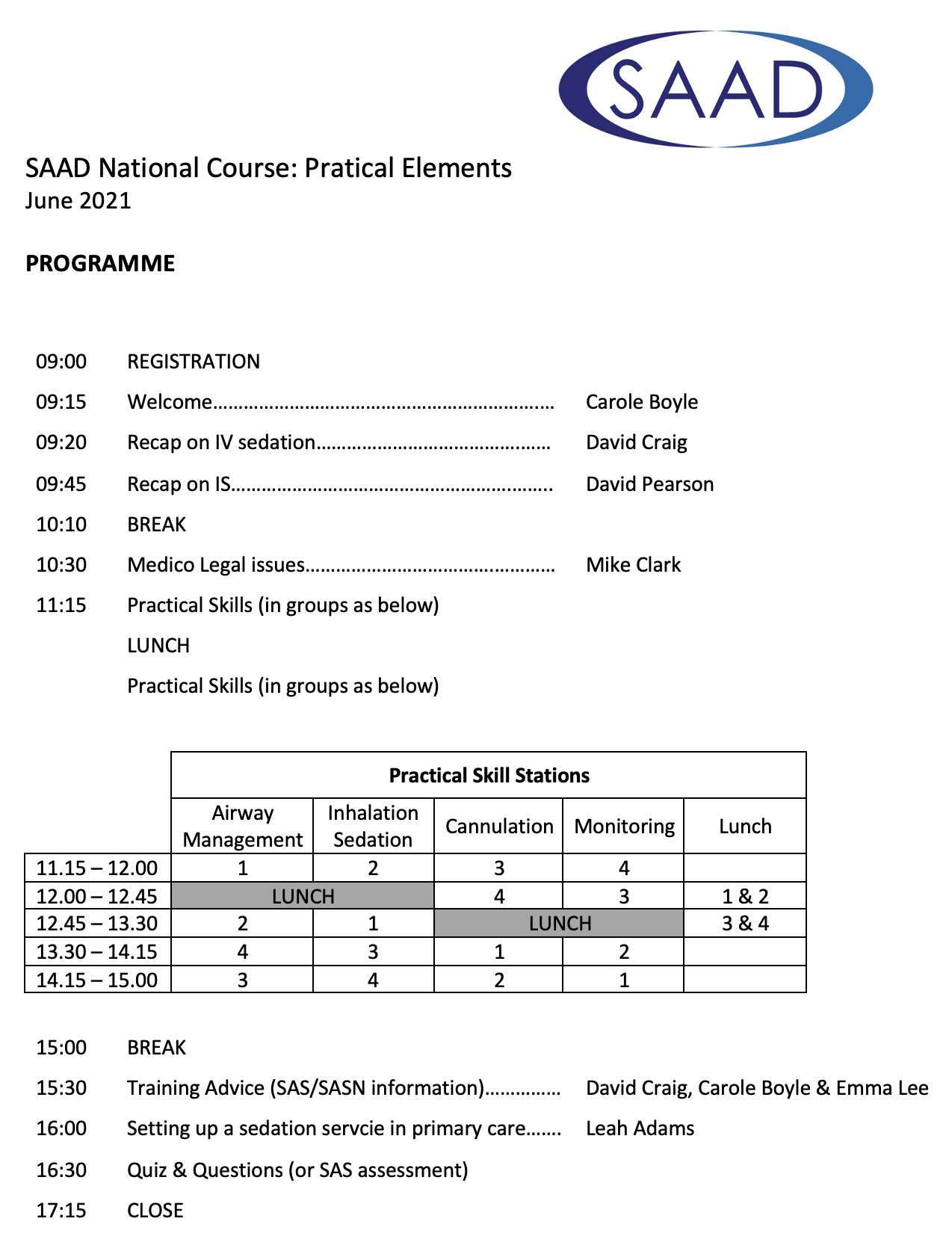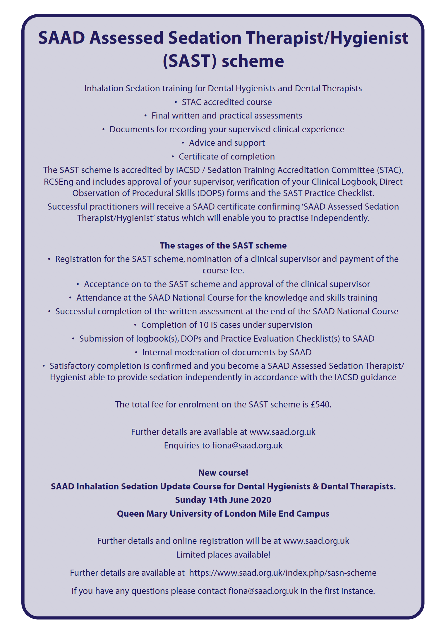 Whether you are attending the SAAD course as a refresher, or if you are new to sedation and about to embark on your supervised clinical experience, the focus of our courses is to ensure that all members of the clinical team are able to deliver safe and effective conscious sedation for their patients who require it.