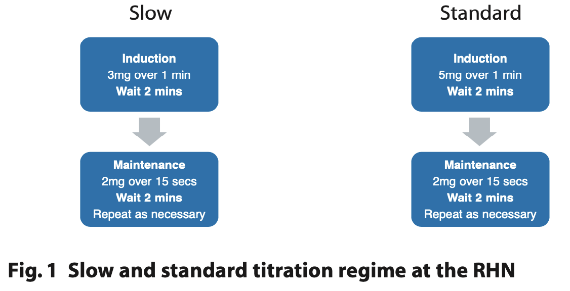 Remimazolam (20 mg per vial) was reconstituted with 20 ml of saline in a 20 ml syringe to be administered 1 mg/1 ml for ease of titration. Depending on the medical status, it was titrated as a slow or standard regime adapted from the drug manufacturers' guidance (Figure 1).14