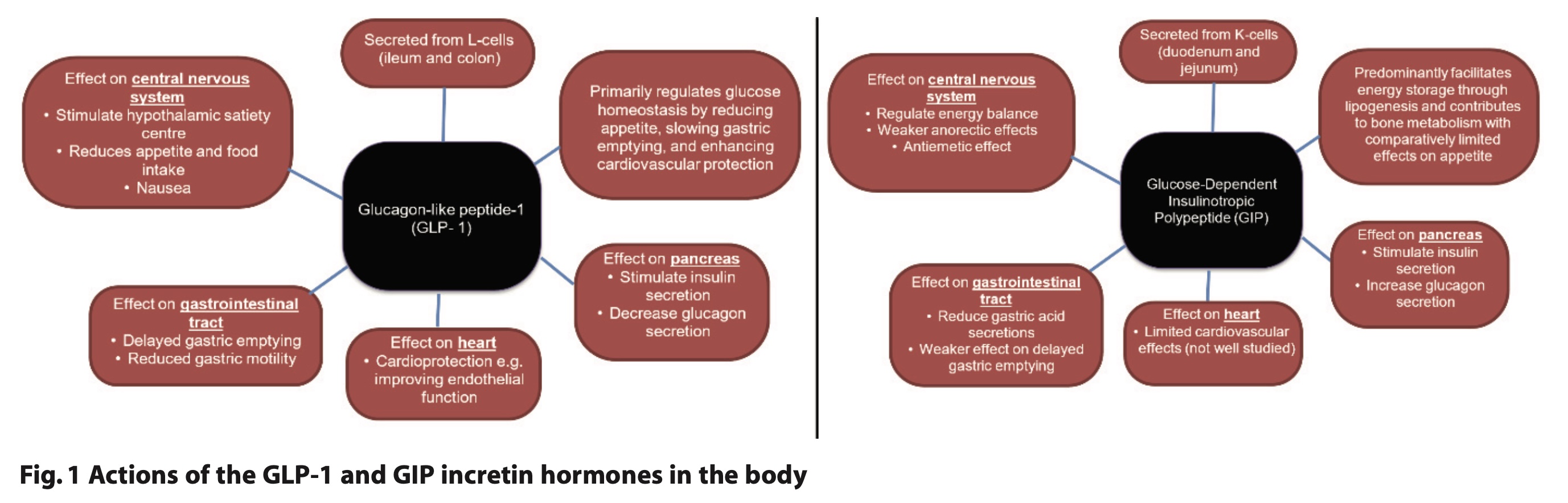 GLP-1 and GIP are incretin hormones released by the body in response to glucose.8 GLP-1 and GIP receptors may be found in the pancreas, central nervous system (CNS), heart and gastrointestinal tract, in addition GLP-1 receptors have been identified in the liver and kidneys (Figure 1).