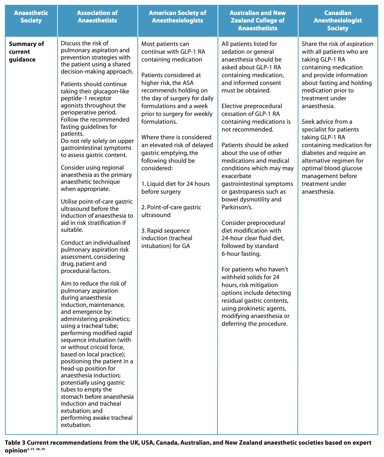 37. El-Boghdadly K, Dhesi J, Fabb P, et al. Elective peri-operative management of adults taking glucagon-like peptide-1 receptor agonists, glucose-dependent insulinotropic peptide agonists and sodium-glucose cotransporter-2 inhibitors: a multidisciplinary consensus statement: A consensus statement from the Association of Anaesthetists, Association of British Clinical Diabetologists, British Obesity and Metabolic Surgery Society, Centre for Perioperative Care, Joint British Diabetes Societies for Inpatient Care, Royal College of Anaesthetists, Society for Obesity and Bariatric Anaesthesia and UK Clinical Pharmacy Association. Anaesth 2025; 80:412-424. DOI: 10.1111/anae.16541.