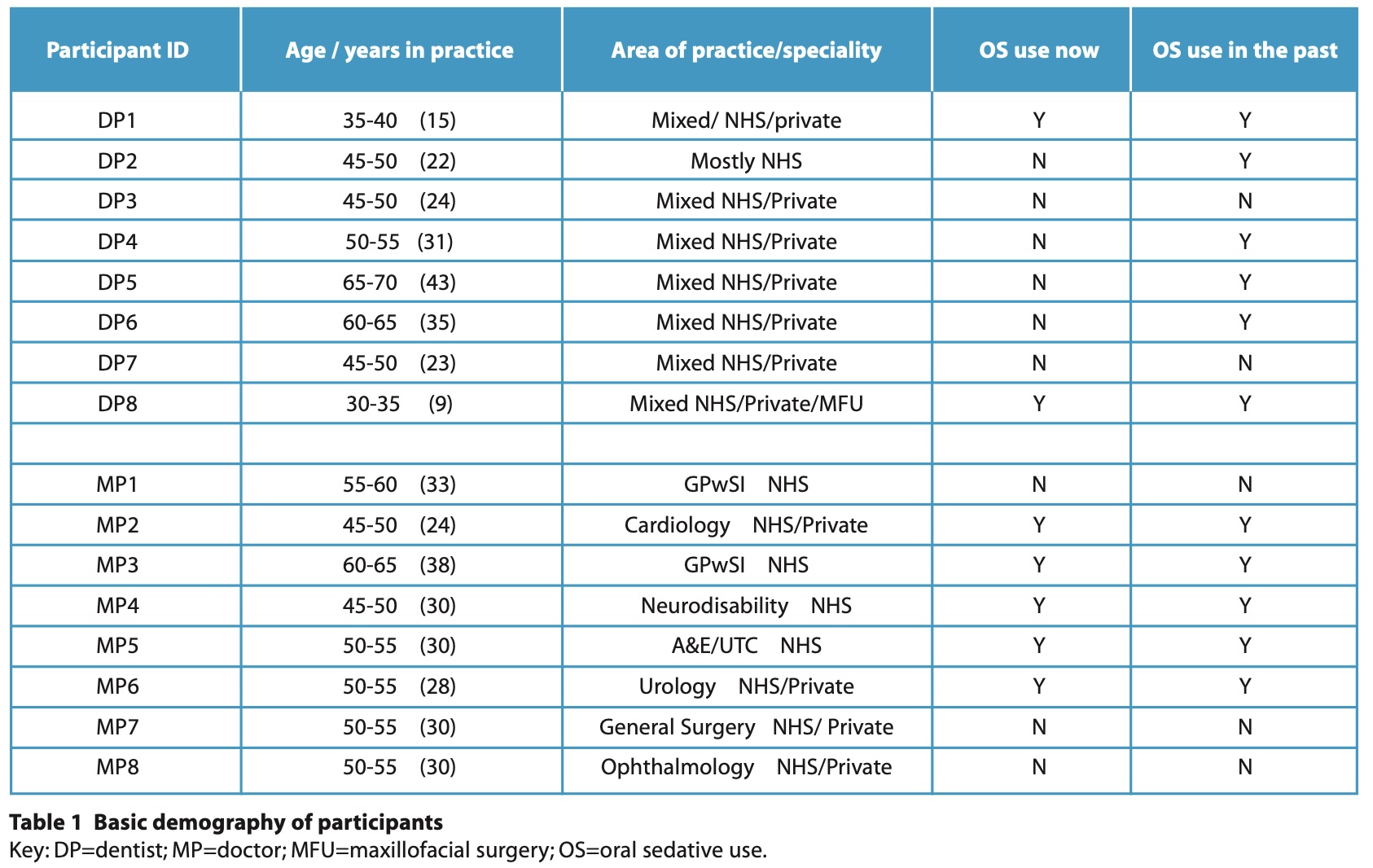 This study aimed to explore dentists’ and doctors’ attitudes to using small dose oral sedatives. The themes which developed highlighted both similarities and differences between both professional groups.