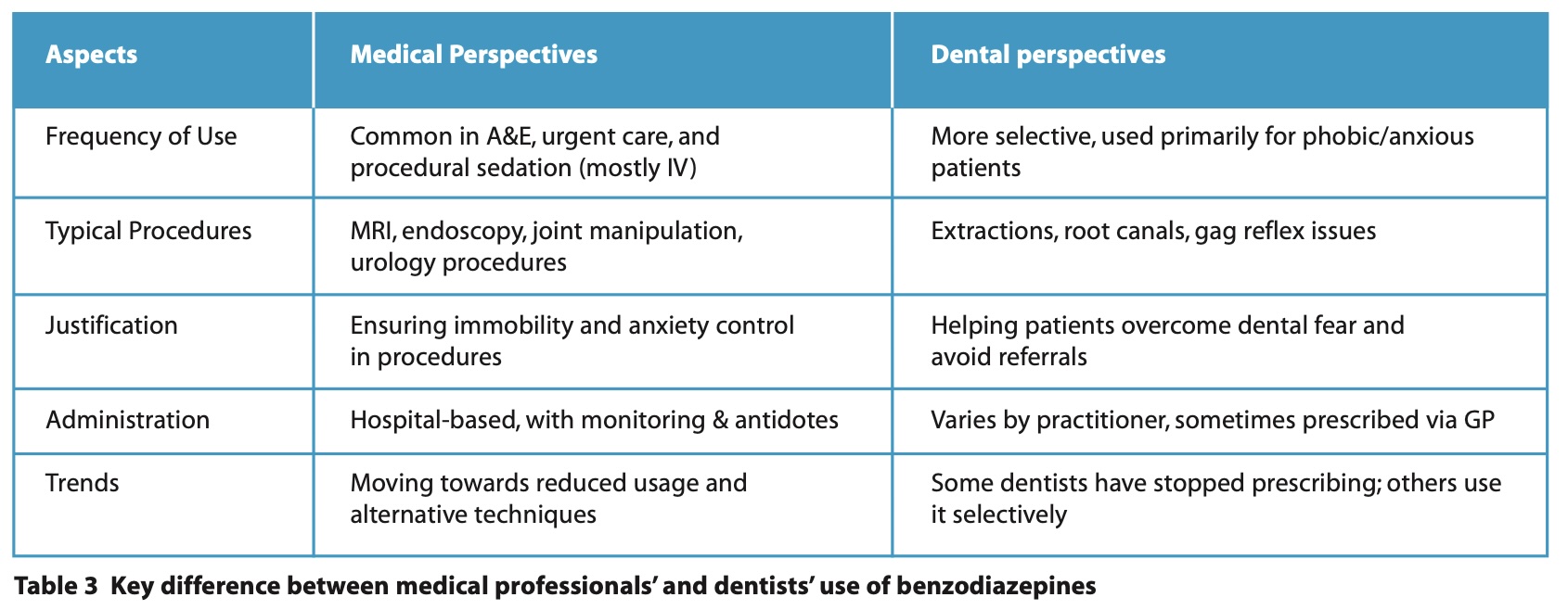 In contrast, dentists expressed a more varied perspective, with some recognising the benefits of benzodiazepines in reducing patient anxiety, facilitating co-operation, and improving treatment experiences, particularly for phobic or highly anxious patients.